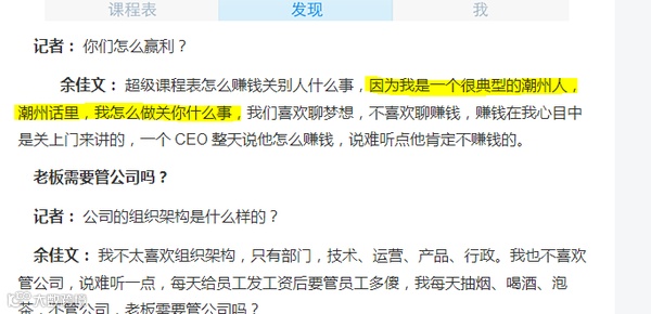 至于这两天上面传播的视频我也看到了,电视里的余佳文和我们当初见到的他像换了个人,打扮新潮了不少,包括视频中闪现的个性和公司场景,包括场下观众听到超课时候的激动情绪,都让我挺意外的,如果这不是一场PR的话,那祝贺这个团队进步了