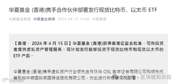 华夏基金(香港)的香港子公司与OSL Digital Securities合作,也获得了香港证监会的批准,计划发行能够投资于比特币和以太币现货的ETF产品。华夏基金表示,将与OSL Digital Securities和托管机构中银国际英国保诚信托有限公司合作,为投资者提供虚拟资产管理服务,并研究部署相关产品。