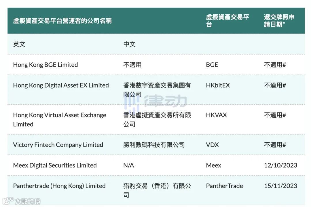 11 月 17 日,香港证监会虚拟资产交易平台申请者名单显示,目前共有六家公司正在申请虚拟资产交易平台牌照,这六家虚拟资产交易平台分别为:BGE、HKbitEX、HKVAX、VDX、Meex、PantherTrade。