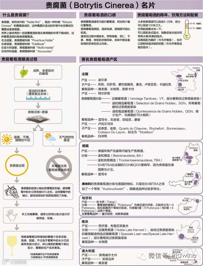 在葡萄酒界,有两种细菌至关重要,其一自然是鼎鼎大名的酵母菌,有了它,葡萄中的糖分才能转化为酒精,从而酿造一杯杯令人回味无穷的葡萄酒;其二就是神秘莫测的贵腐菌,世界上最出色、最昂贵、最浓郁的甜葡萄酒之一--贵腐葡萄酒就是在它的作用下酿造得到的。下面这张“名片”介绍了贵腐菌的详细资料和贵腐葡萄酒的具体产区、分级以及酿造品种: