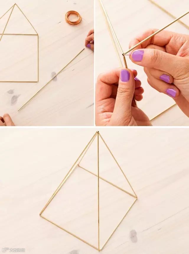⑤剪短末端的铜丝,将底部的连接点固定起来,线头尽可能隐藏。此时金字塔造型已经完成了一半。