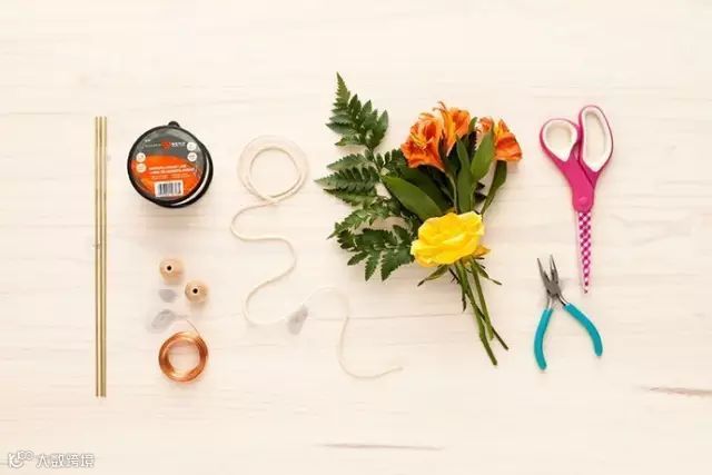 首先准备材料,我们需要用的材料有金属铜管、细铜丝、木头珠子、棉绳、鲜花和绿叶若干。此外还有剪刀、钳子、绿胶带等。