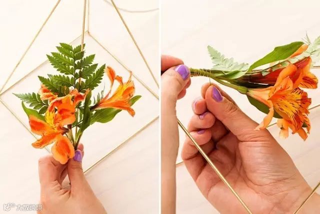 ⑩最后用铜丝将小花束固定在金字塔造型的其中一根金属管上,并减去超出金字塔底座的花茎。露出来的铜丝也是装饰的一部分,所以在缠绕的时候要注意均匀美观。