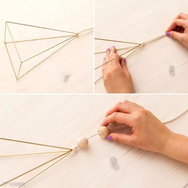 ⑧金字塔的顶部系上棉绳,穿2颗木头珠子会与作品的金属质感形成对比,使作品的丰富性更强,如果没有的话也可以不加,或者换成其他材质的装饰品。