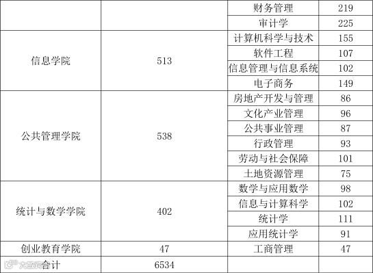 现有57个本科专业,其中税收学、金融学、国际经济与贸易、工商管理、市场营销、会计学、审计学、法学、电子商务等9个专业为国家级一流本科专业建设点;财政学、金融学、市场营销、会计学、法学等5个专业为国家级特色专业。
