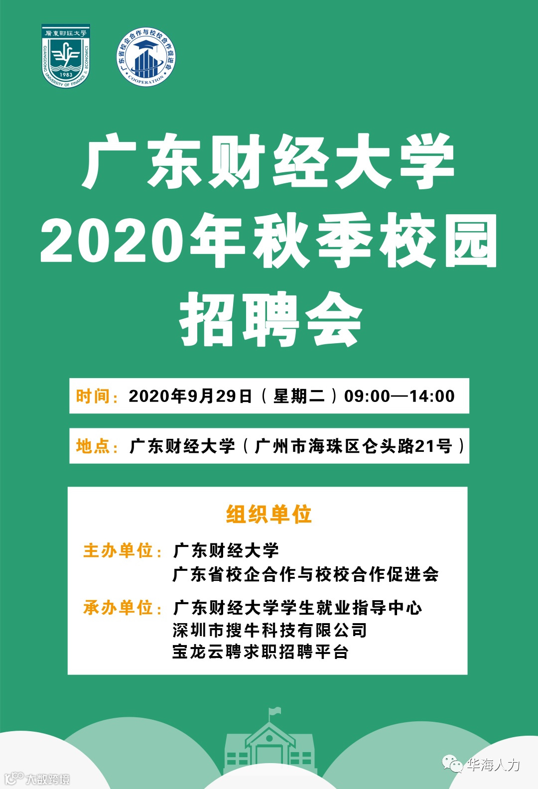 为贯彻落实广东省省委、省政府关于做好高校毕业生就业实习工作的一系列重要部署,进一步做好学校毕业生与各用人单位的供求信息沟通工作、搭建单位招聘与学生就业的有效平台,营造良好的就业氛围,为毕业生就业提供优质的服务;同时满足我省行业发展的人才需求,保障企业人才团队、人才梯队建设的需要,帮助企业招到岗位匹配的专业人才和后备人才,并推动优势企业与学校建立长期、有效的深层次合作关系,广东省校企合作与校校合作促进会联合广东财经大学学生就业指导中心举办广东财经大学2020年秋季校园招聘会。