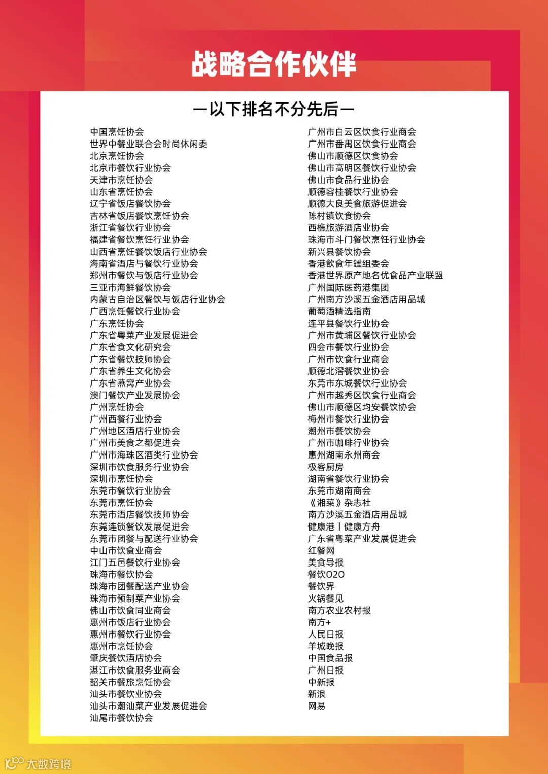 本届品牌参展企业包括:厨友荟、海格娜、劲恒、厨纪、国台、海天味业、百香顺、佐味家、春之源、徽味鲜、义龙、鸿贵、澳仕、圣恩、日远饮品、益膳、滋味库、易太、顺营、滕圣、牛上道、滋味库、劲霸、建豪、聚丁乐、中食、盛洋、蚨海、万振、爱厨易、天农、御膳房、康巨、德盈、津津食品、宏方水产、小茶鲜、雷鲜生、八合里、维氏、川馥记、九州陆川、味尚鲜、李老二、福贤记、长治凯兴、东灶餐饮、味滋香、志伟机械、智多福、诚淘、荣昌、雅道、白思味、格莱瑞、骄启、斋外斋、情乡源、味丰德、永泽、粤香食品、桥头火锅、亚虹、餐得易、卓功、漫味龙厨、金福华、巴汀机械、穗扬、云海阁、珲春老姬、速源等(排名不分先后)。