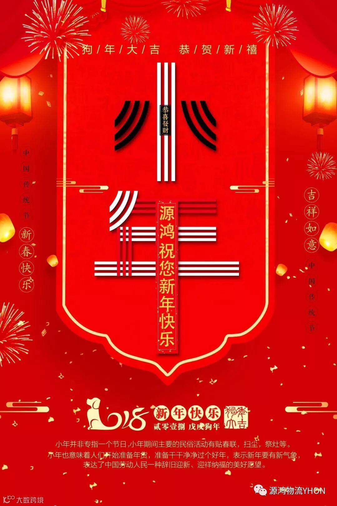 源鸿物流全体人员恭祝全体合作伙伴、广大客户、社会各界人士:一祝快乐没烦恼,二祝幸福微微笑,三祝健康吉祥抱,四祝家和万事好,五祝新年好运到!祝小年喜气洋洋,福气盈满高堂,好运时刻流荡,家业永远兴旺,家人平安健康,心情美好舒畅,美名誉满荣光,回头金犬呈祥,展望财富八方。祝小年快乐!