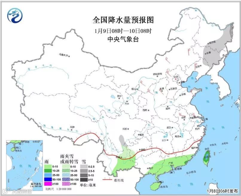 9日08时至10日08时,南方降水过程趋于结束。黑龙江东部、吉林中东部、山东半岛东部等地有小雪或雨夹雪,局地有中雪;云南东部、华南中东部、台湾等地有小到中雨,其中台湾中部局地有大雨;中东部部分地区有4~6级偏北风。渤海、黄海中部和南部、东海北部、台湾海峡、南海北部、中部和西南部的部分海域将有8级、阵风9~10级的大风。