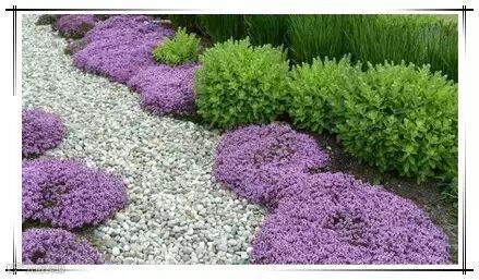 匍匐百里香是长得低矮的的芳香植物,上面就是它们开花的时候的状态,生性强健,百里香也是有很多品种的,上面这些就长得特别低矮,最高也是7厘米左右,抗病性也很好,还能用来吃。