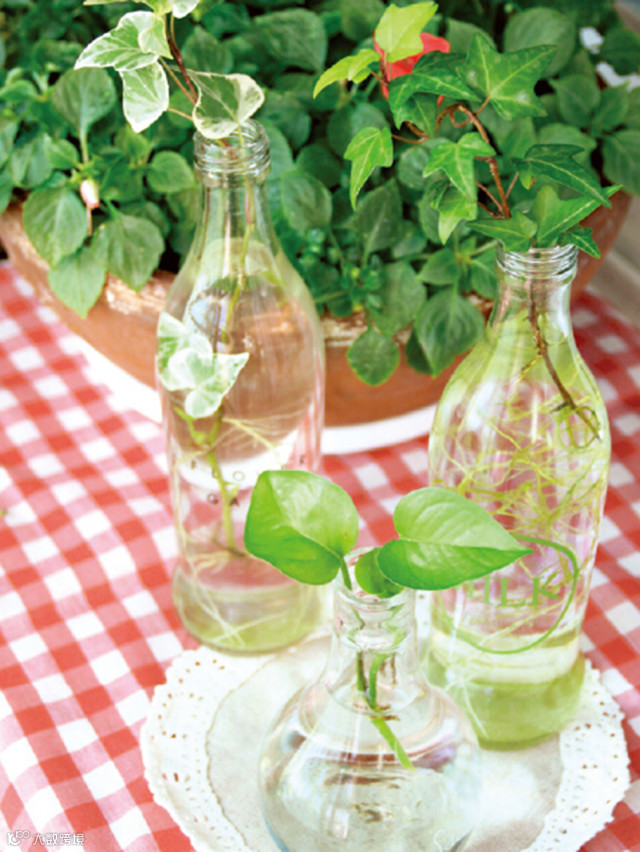 这是最简单的水培方式。只要将一节枝条放入装有清水的玻璃瓶中即可。只需要1~2周,你就能亲眼见证植物在水中生根的神奇画面。当瓶中的水只剩下一半时,就需要进行补充了。另外,每个月至少要换水1次。