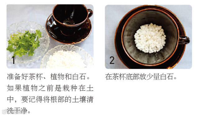 想必你家中也有那么几个弃之可惜、用之无趣的茶杯吧?现在就是它们派上用场的时候啦。像茶杯这样开口较大的容器非常适合水培植物。为了防止植物倾倒,最好放一些白石在杯底。记得杯中水量减少时要及时补充。