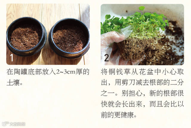 水培也可以与土培相结合。将土壤铺在陶罐底部,再装上适量的清水,这样土中丰富的营养物质就会更好地帮助植物成长了。最适合用这种方式栽培的植物莫过于铜钱草。铜钱草生命力十分旺盛,不需几天就能成倍增长。记得当罐中清水减少时,要及时补充。