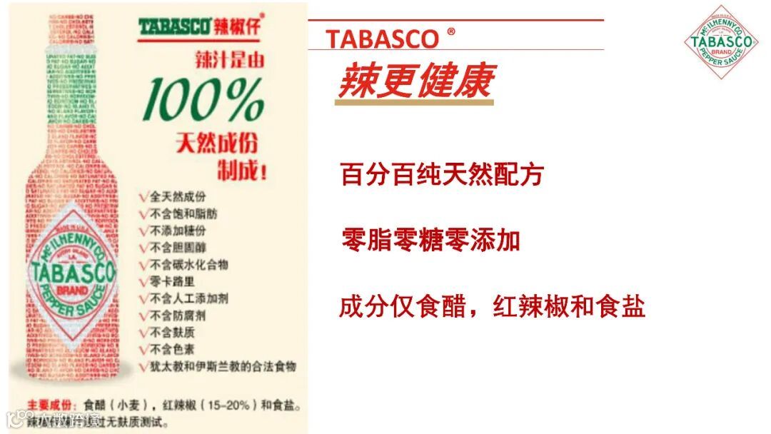 风靡全球的TABASCO®美国辣椒仔®,在150多年里为全球超过200个国家和地区的餐厅与美食爱好者提供让食物更美味的调味品。我们始终坚持采用酿造过威士忌的橡木桶和盐,对精心培育的辣椒进行三年的自然发酵后加入酿造食醋,制作出低卡低脂、零添加剂,没有任何防腐剂及色素的TABASCO®经典风味。