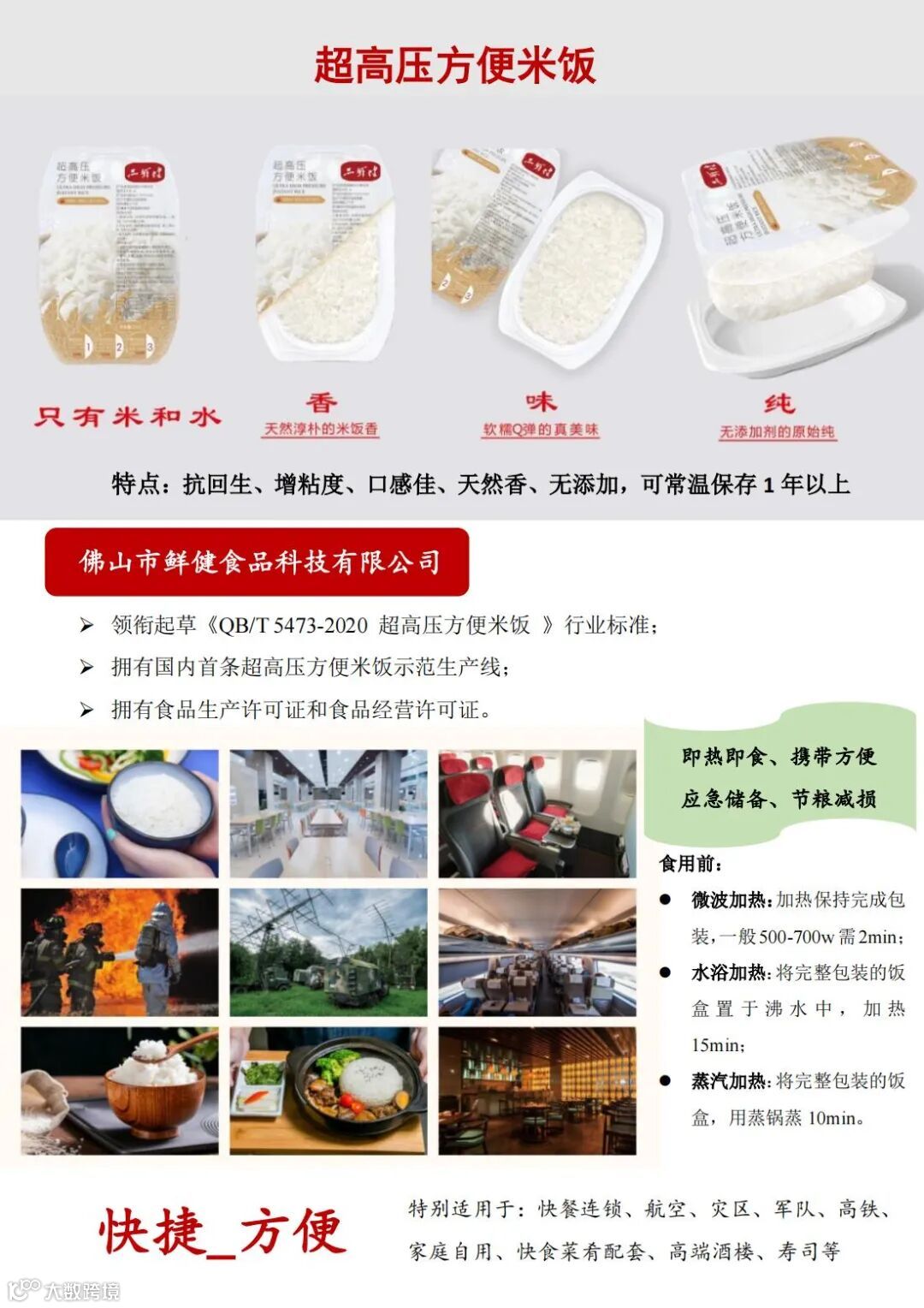 鲜健公司国内独家生产的超高压方便米饭,已推向市场,受到军队、餐饮业和外商的好评。