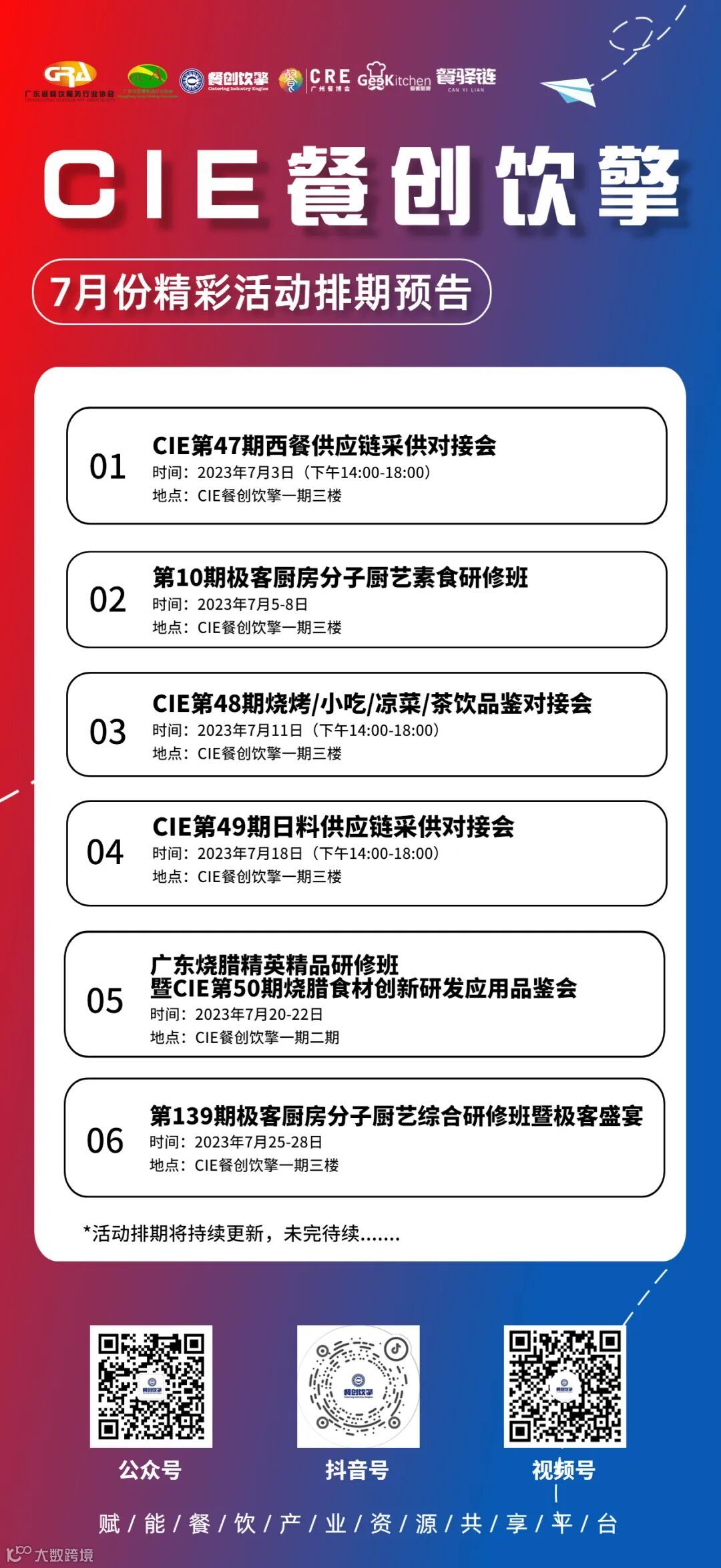 CIE餐创饮擎占地面积约5000平方米,配套共享烹饪厨房、美食品鉴区、优质产品展示区、共享茶咖室、共享会议室、共享办公室等。由广东省餐饮服务行业协会、广东省团餐配送行业协会、极客厨房、CRE中国餐博会、餐驿链联合发起,共同打造餐饮产业生态链的第三方赋能服务平台,致力为餐饮上下游产业链提供线上+线下一体化综合服务,包括:智慧餐饮、数字化管理、供应链协同、食安营养、教育培训、品牌孵化、展览发布、线上商城、研发定制、美食体验、项目孵化、集采共配、餐饮投融资等综合服务,助力企业创造价值,实现开源、节流、增效、控风险。