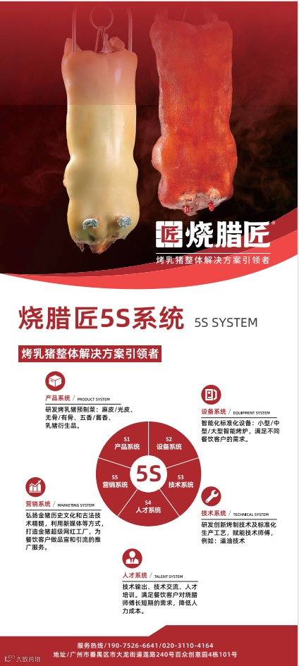 传承金猪三千年历史文化及古法烤制技术的精髓,针对新时代餐饮客户的需求和痛点,研发出烤乳猪预制菜。建有资质齐全、规范化的乳猪加工厂,打造产品、技术、设备、人才及营销推广的5S服务系统。形成“烤乳猪整体解决方案”服务为核心的竞争力,打造烧腊匠品牌,成为烤乳猪整体解决方案引领者。