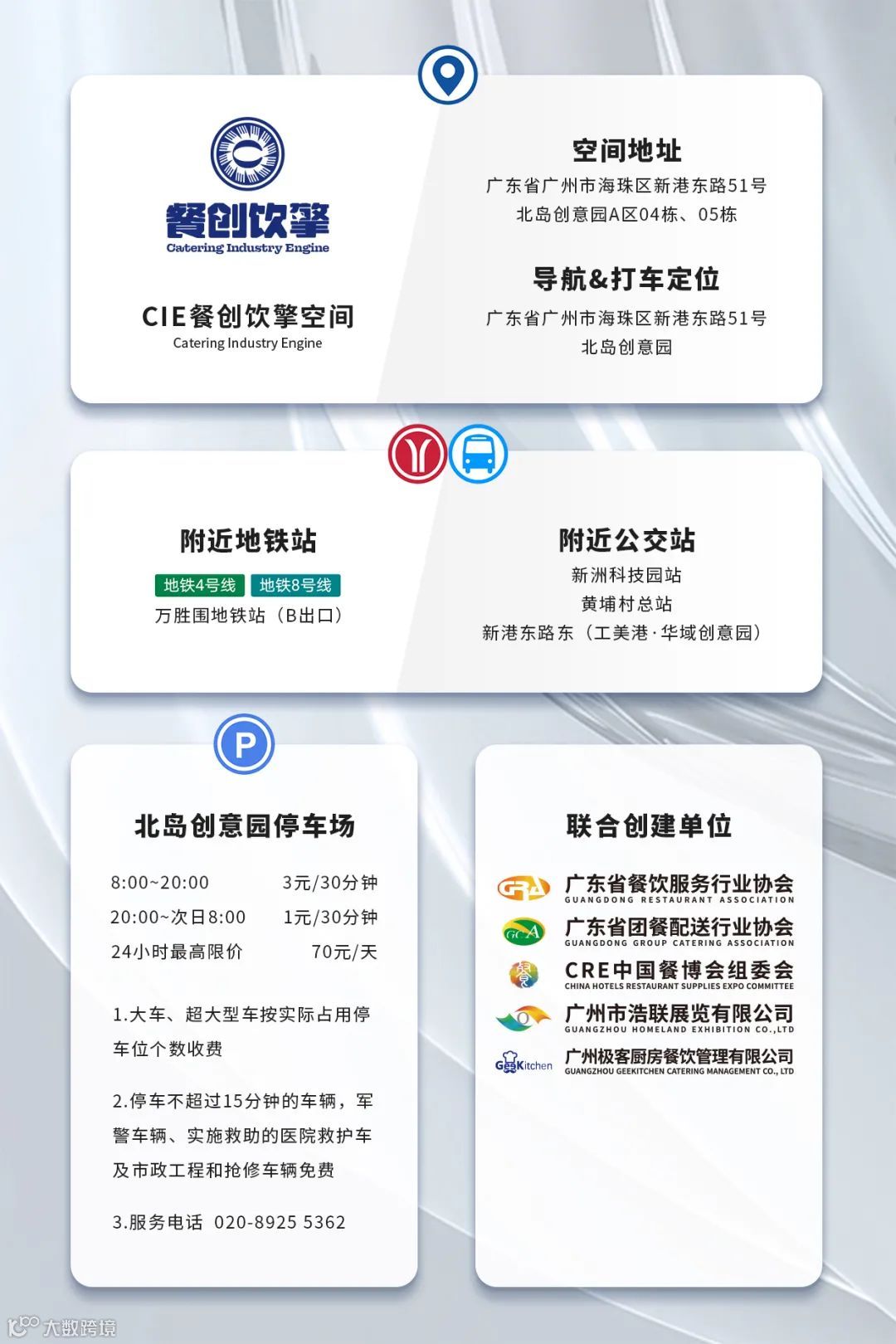 CIE餐创饮擎占地面积约5000平方米,配套共享烹饪厨房、美食品鉴区、优质产品展示区、共享茶咖室、共享会议室、共享办公室等。由广东省餐饮服务行业协会、广东省团餐配送行业协会、极客厨房、CRE中国餐博会、餐驿链联合发起,共同打造餐饮产业生态链的第三方赋能服务平台,致力为餐饮上下游产业链提供线上+线下一体化综合服务,包括:智慧餐饮、数字化管理、供应链协同、食安营养、教育培训、品牌孵化、展览发布、线上商城、研发定制、美食体验、项目孵化、集采共配、餐饮投融资等综合服务,助力企业创造价值,实现开源、节流、增效、控风险。