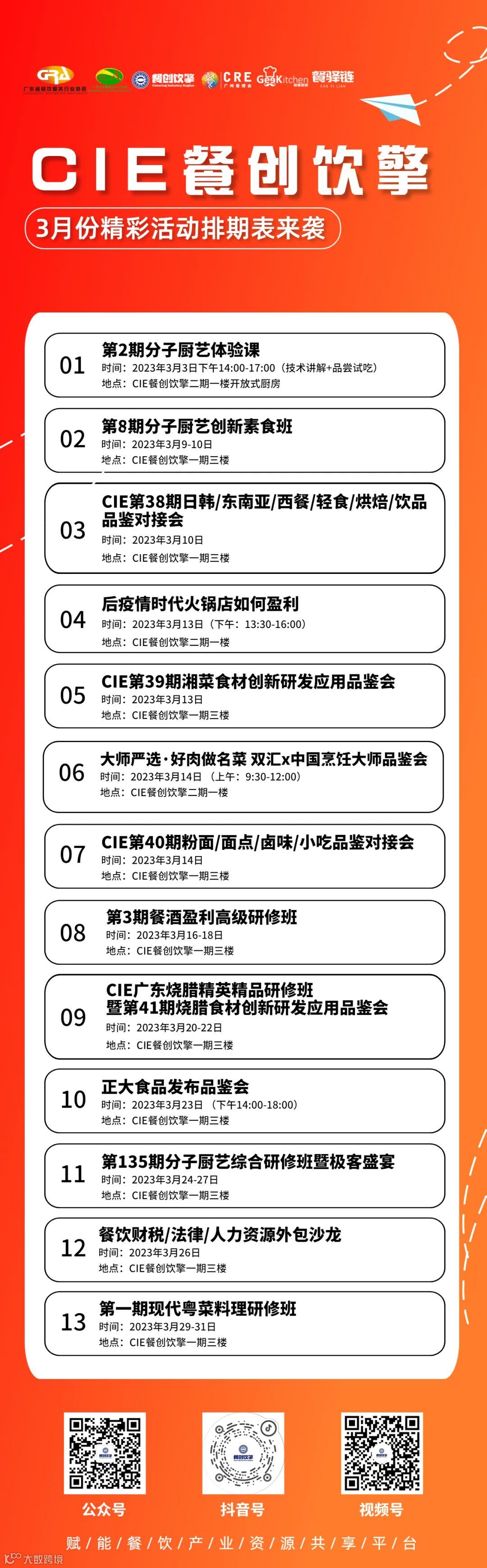 CIE餐创饮擎占地面积约5000平方米,配套共享烹饪厨房、美食品鉴区、优质产品展示区、共享茶咖室、共享会议室、共享办公室等。由广东省餐饮服务行业协会、广东省团餐配送行业协会、极客厨房、CRE中国餐博会、餐驿链联合发起,共同打造餐饮产业生态链的第三方赋能服务平台,致力为餐饮上下游产业链提供线上+线下一体化综合服务,包括:智慧餐饮、数字化管理、供应链协同、食安营养、教育培训、品牌孵化、展览发布、线上商城、研发定制、美食体验、项目孵化、集采共配、餐饮投融资等综合服务,助力企业创造价值,实现开源、节流、增效、控风险。