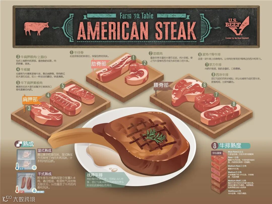 美国牛只是以玉米喂饲,因此牛肉没有草腥味,这也是与草饲牛肉最不同的地方。美国牛肉的另一个特色就是它的油花——多且白,也是外观上最大的特征。油花含量的丰富程度决定了牛肉中所含肉汁的多与寡。