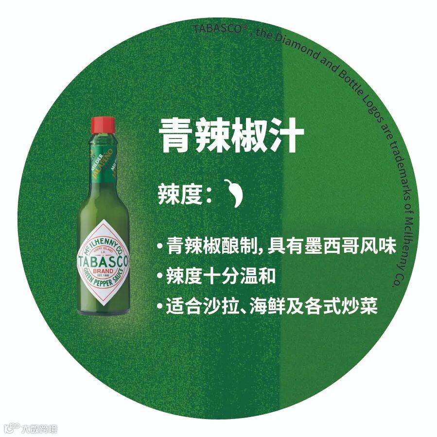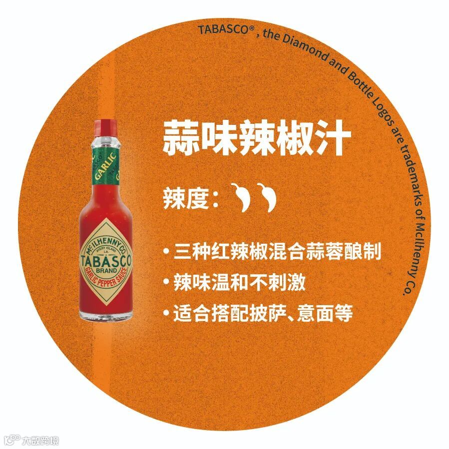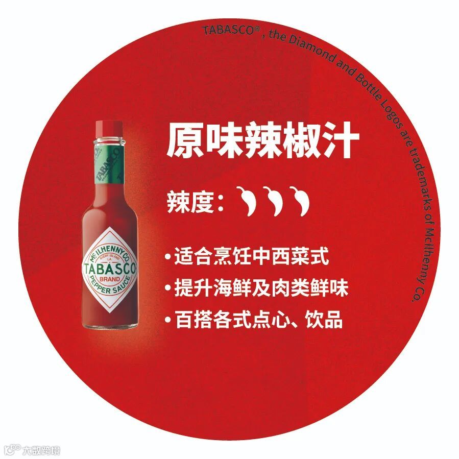 风靡全球的TABASCO®美国辣椒仔®,在150多年里为全球超过200个国家和地区的餐厅与美食爱好者提供让食物更美味的调味品。我们始终坚持采用酿造过威士忌的橡木桶和盐,对精心培育的辣椒进行三年的自然发酵后加入酿造食醋,制作出低卡低脂、零添加剂,没有任何防腐剂及色素的TABASCO®经典风味。