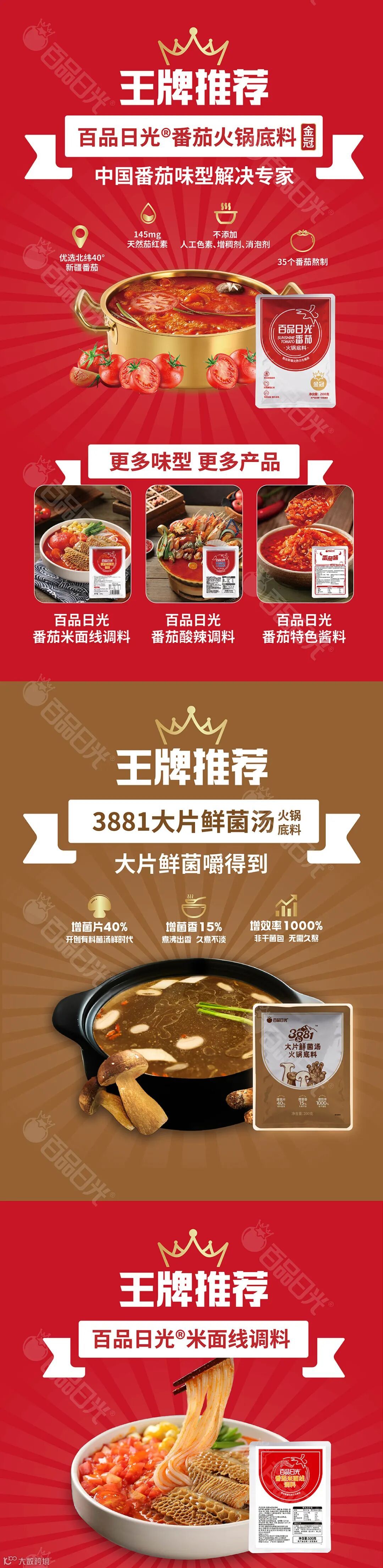 明星产品百品日光®番茄,作为番茄底料领导品牌。从源头出发, 360度全产业链管控,以安全为核心,提供美味、稳定、优质的番茄底料解决方案。优选新疆完熟番茄,每袋由35个番茄熬制,含有145mg天然茄红素,不添加人工色素、增稠剂、消泡剂,营养健康,安全稳定,为世界献上中国的番茄好味。