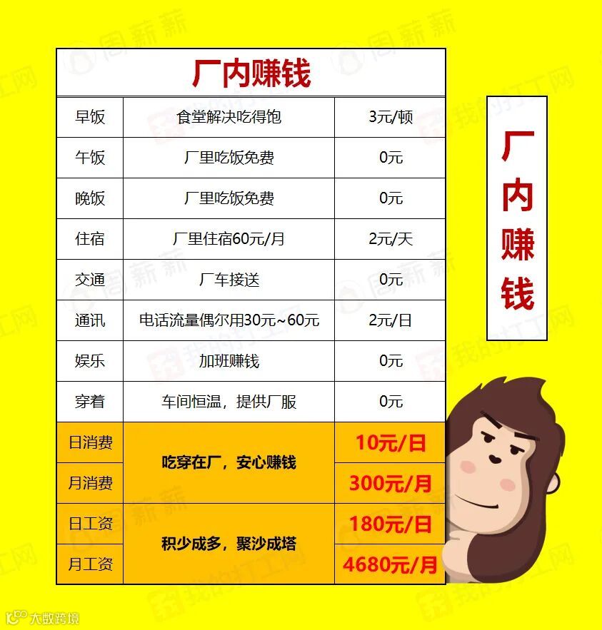 如果你在厂里稳定上班的话,不仅可以包吃住,还能赚钱。工资按照按 18元/时,做六休一,每天10小时计算: