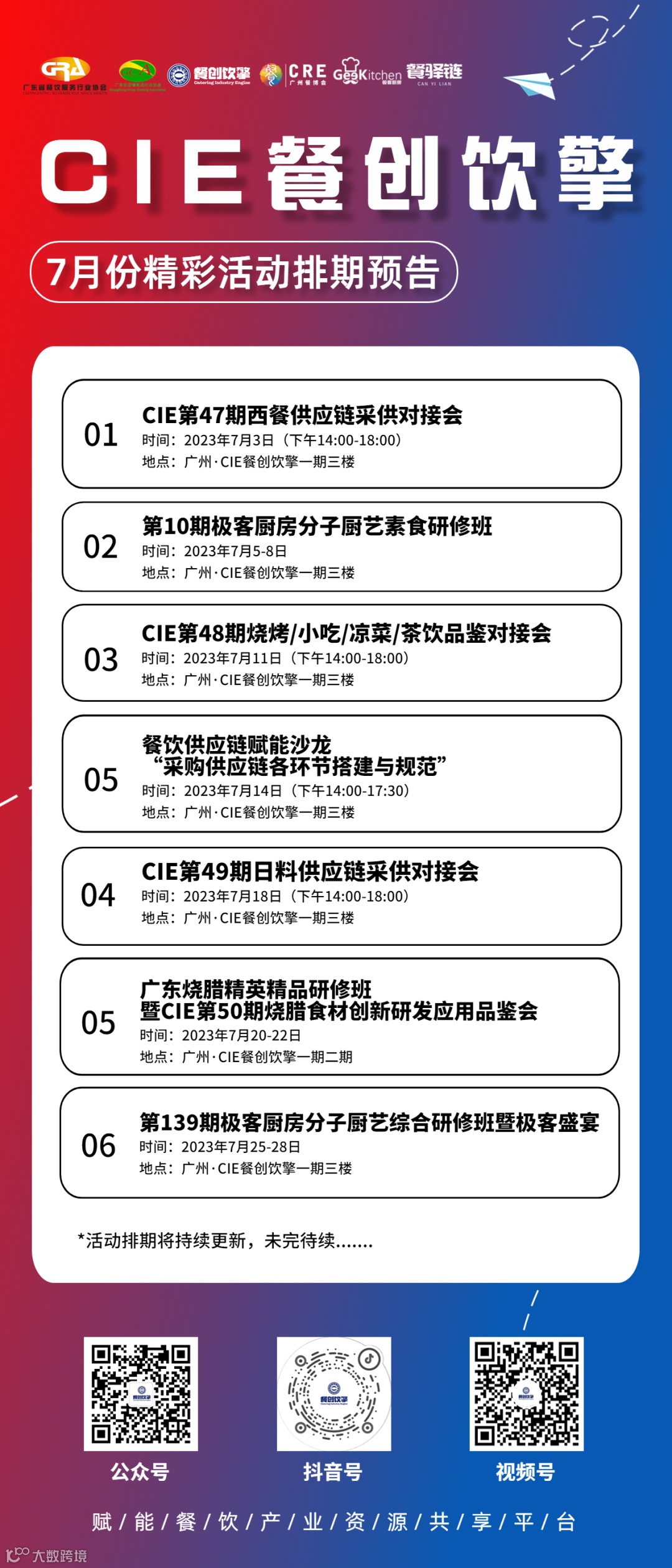 CIE餐创饮擎占地面积约5000平方米,配套共享烹饪厨房、美食品鉴区、优质产品展示区、共享茶咖室、共享会议室、共享办公室等。由广东省餐饮服务行业协会、广东省团餐配送行业协会、极客厨房、CRE中国餐博会、餐驿链联合发起,共同打造餐饮产业生态链的第三方赋能服务平台,致力为餐饮上下游产业链提供线上+线下一体化综合服务,包括:智慧餐饮、数字化管理、供应链协同、食安营养、教育培训、品牌孵化、展览发布、线上商城、研发定制、美食体验、项目孵化、集采共配、餐饮投融资等综合服务,助力企业创造价值,实现开源、节流、增效、控风险。