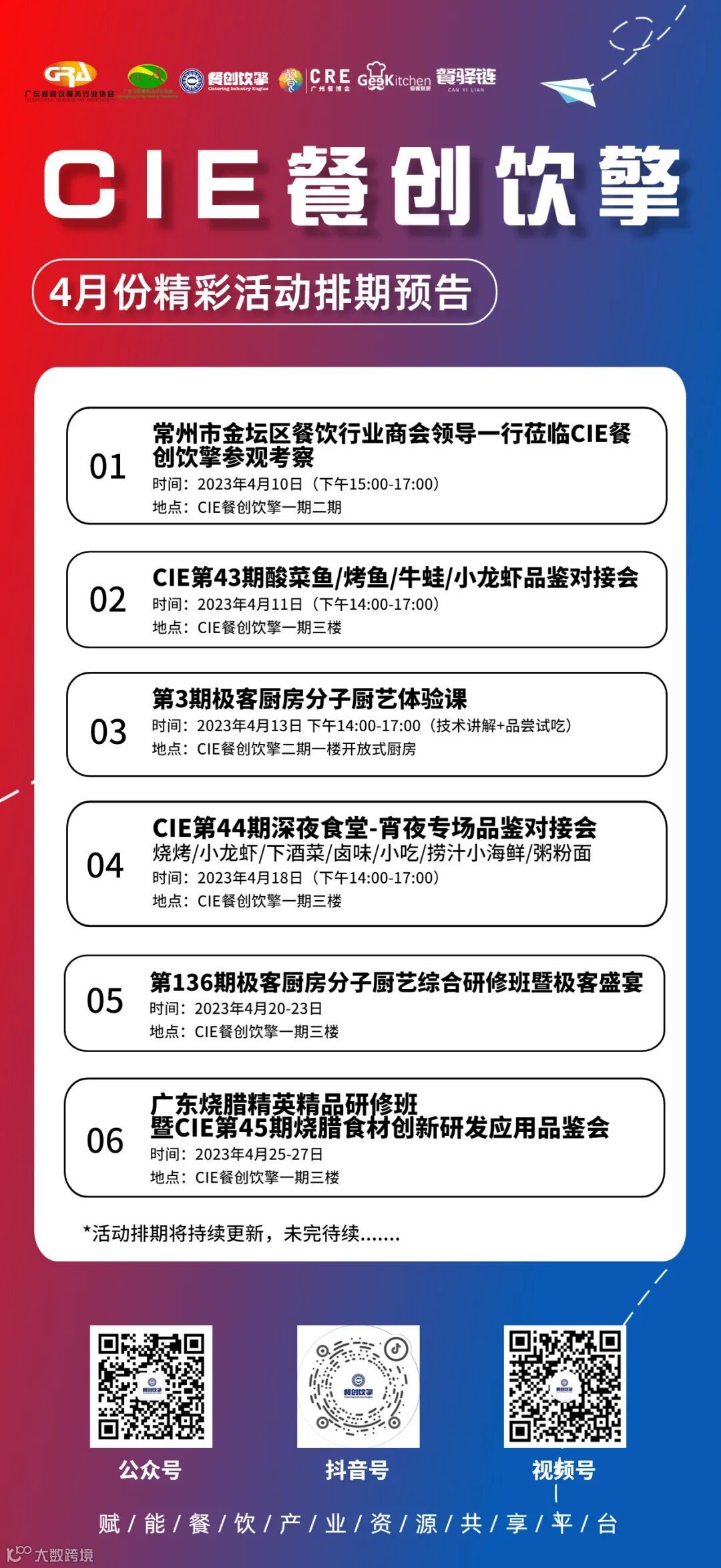 CIE餐创饮擎占地面积约5000平方米,配套共享烹饪厨房、美食品鉴区、优质产品展示区、共享茶咖室、共享会议室、共享办公室等。由广东省餐饮服务行业协会、广东省团餐配送行业协会、极客厨房、CRE中国餐博会、餐驿链联合发起,共同打造餐饮产业生态链的第三方赋能服务平台,致力为餐饮上下游产业链提供线上+线下一体化综合服务,包括:智慧餐饮、数字化管理、供应链协同、食安营养、教育培训、品牌孵化、展览发布、线上商城、研发定制、美食体验、项目孵化、集采共配、餐饮投融资等综合服务,助力企业创造价值,实现开源、节流、增效、控风险。