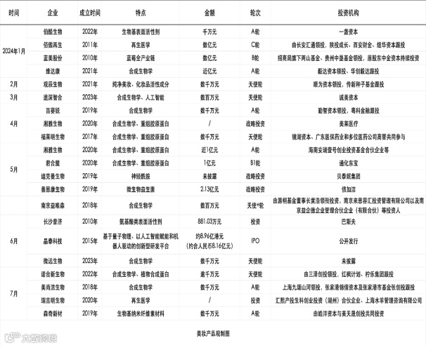 今年上半年合成生物学相关企业达到11起。他们分别是维达康、百葵锐、湘雅生物、途深智合、福莱明生物、君达合盟、南京益唯森、微远生物、诺合新生物、美尚洁生物。