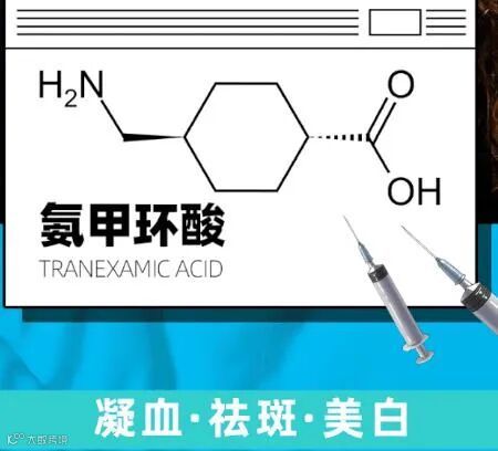 :减退黑色素沉着。对于抑制黑色素形成、预防黑斑、雀斑的出现有绝佳的效果。有效治疗、预防黄褐斑。现今氨甲环酸在皮肤科治疗黄褐斑中是一种不可或缺的药物,有关氨甲环酸临床应用范围包含了皮肤外用、皮肤微量注射、静脉滴注和口服疗法。氨甲环酸的安全性高,不良反应少,疗效好,已被广泛用于皮肤美白产品和黄褐斑治疗制剂,单独使用或联合其他美白成分。