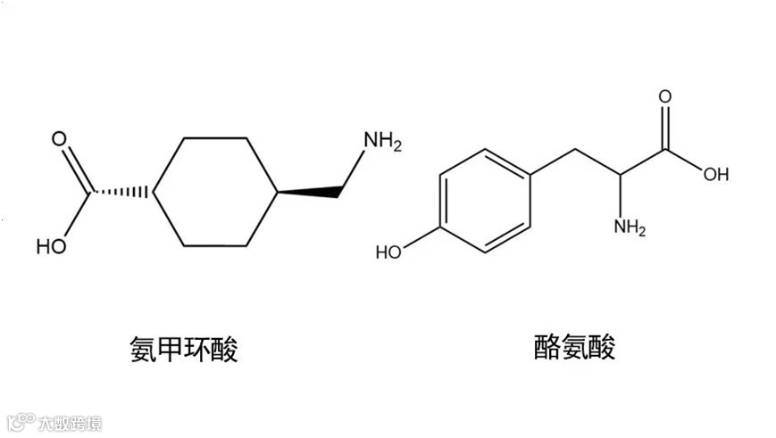 氨甲环酸是一种赖氨酸合成衍生物,其化学结构为对氨甲基环已烷羧酸,与酪氨酸的化学结构部分相似,均含有六元环和羧基(-COOH)的结构。