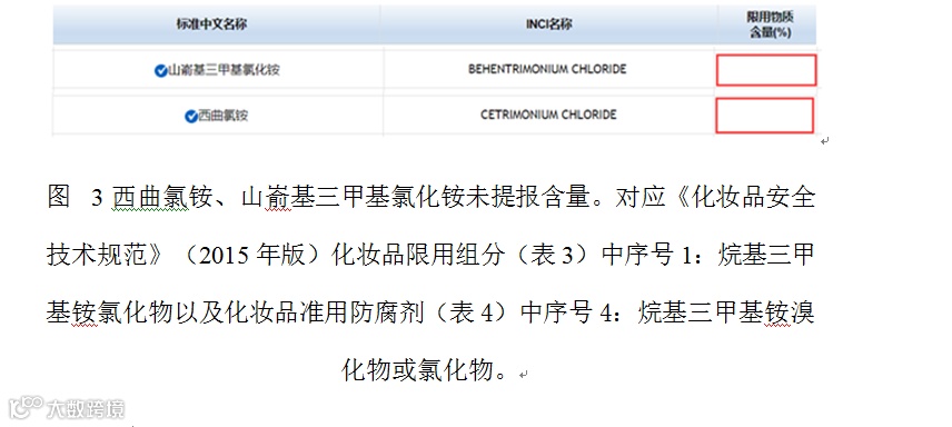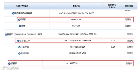 图 4 图中所示甘草酸二钾、甲萘醌、尿囊素均不在《化妆品安全技术规范》(2015年版)准用防腐剂表(表4)中,这些原料使用目的不符合要求。