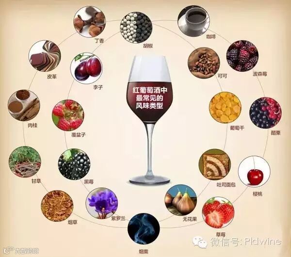 红葡萄酒一般带有较为明显的红色水果风味,常见的用来形容红葡萄酒风味的词语有:樱桃、李子、草莓、黑莓、覆盆子、醋栗、波森莓,以及葡萄干、无花果、黑(白)胡椒、丁香、肉桂、咖啡、可可、烟草、皮革、甘草、烤面包、烟熏、紫罗兰等。