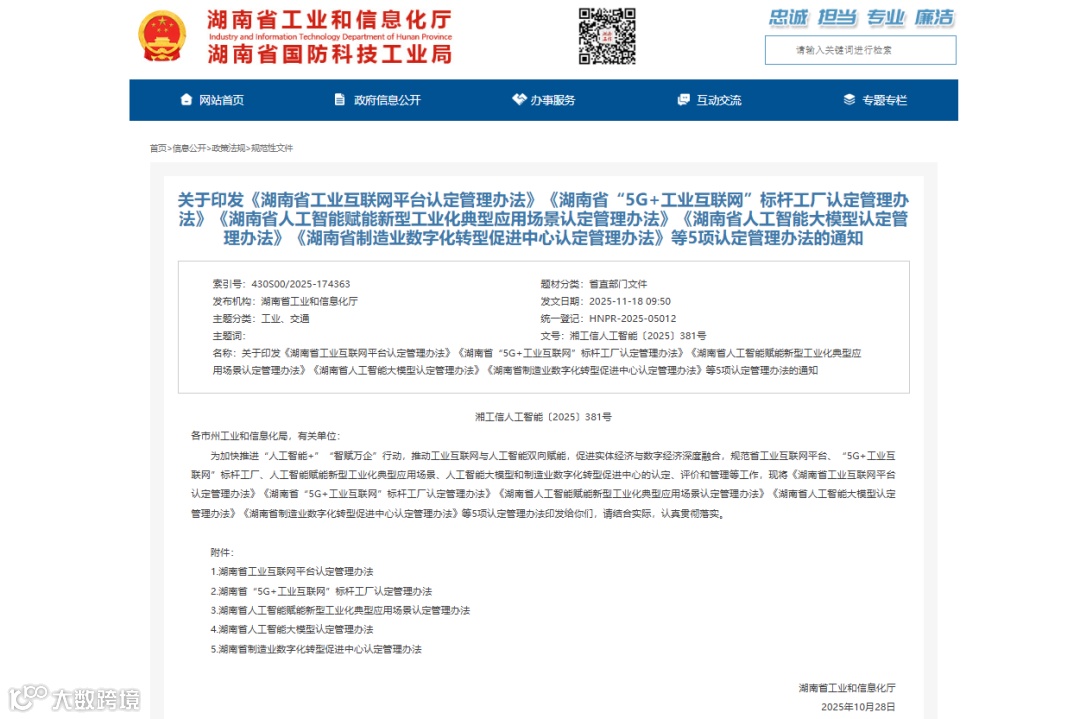 近日,湖南省工业和信息化厅印发了《关于印发〈湖南省工业互联网平台认定管理办法〉〈湖南省“5G+工业互联网”标杆工厂认定管理办法〉〈湖南省人工智能赋能新型工业化典型应用场景认定管理办法〉〈湖南省人工智能大模型认定管理办法〉〈湖南省制造业数字化转型促进中心认定管理办法〉等5项认定管理办法的通知》(湘工信人工智能〔2025〕381号,以下简称5项《认定管理办法》)。
