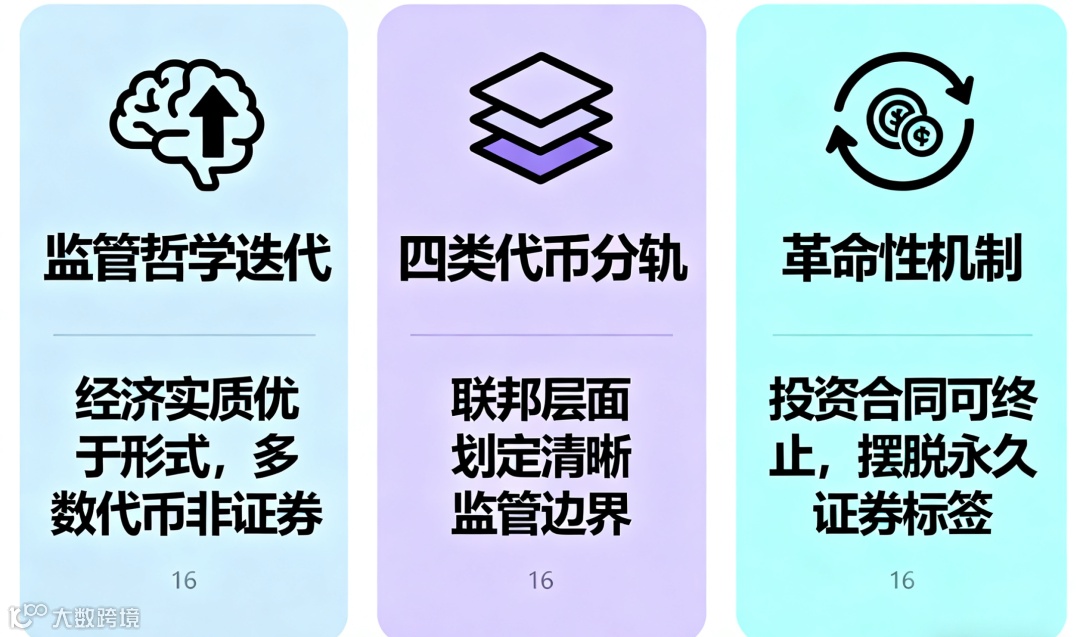 革命性机制:首次承认"投资合同可终止",去中心化网络代币在项目成熟、控制权分散后,可摆脱永久证券标签,为行业提供合规出口。