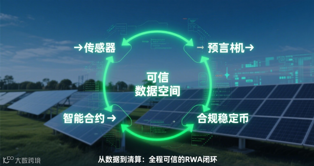 真正的 RWA,该是 “数据原生可信” 的生命体:资产数据从产生到清算,全程无需人工干预,且每一步都能实时核验。就像某光伏电站项目:每块光伏板搭载的物联网传感器,实时捕捉发电功率、设备温度等数据,经可信预言机加密传至链上;收益分成无需人工核算,智能合约会循着实时数据自动计算,再通过合规稳定币完成资金流转。这 “传感器→预言机→合约→稳定币” 的闭环,才是可信数据空间的灵魂,也是 RWA 区别于传统资产证券化的真正底气。