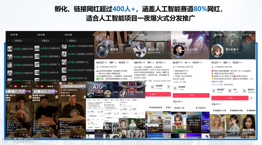 目前 AI 觉醒岛已成功孵化、链接网红超过 400 人+,涵盖人工智能赛道 80%网红,服务于 500 多个千人级的社群,与百余家垂直媒体建立了合作关系,实现了全网百万级精准流量的覆盖。