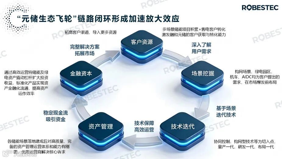 “元储·海内经”不仅是一个技术架构,更像是一个和使用者协同可持续演进的操作系统。它通过客户资源导入、场景深度挖掘、技术应用分享、功能集合迭代、资产聚合运营、资本流通赋能等环节联动,形成“生态飞轮”效应,在降低能源优化门槛的同时,携手合作伙伴共建生态,实现储能资产在全生命周期内的价值最大化,以及生态合作伙伴的收益最大化。