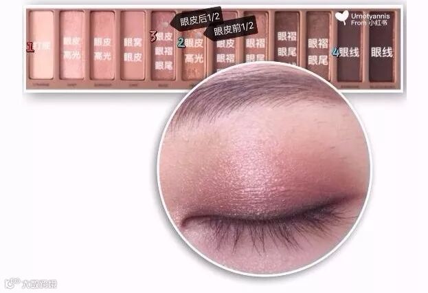 首先用#1沿着眼线向上晕染整个眼窝,然后在眼皮前1/2处用#2晕染,眼皮后1/2处用#3加以晕染,最后整个眼窝晕染直至自然融合。