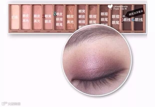 首先,用#1沿着眼线向上晕染整个眼窝,然后用#2在眼窝眼尾叠加晕染,直至自然融合。