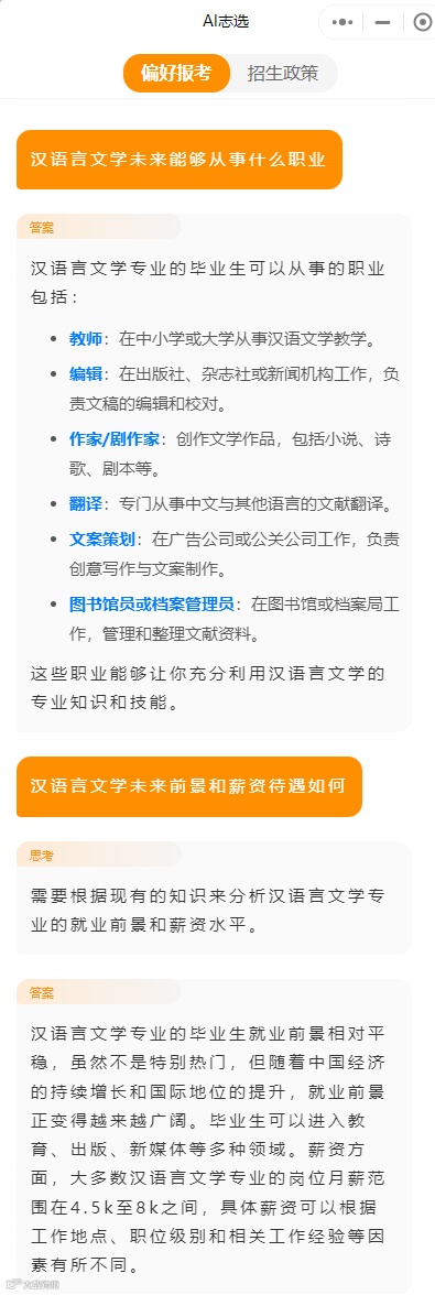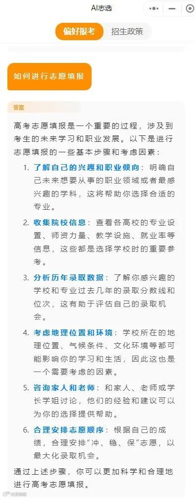 考生不仅可以得到高考志愿填报的建议,还可以通过个性化问题获得更具针对性的帮助!