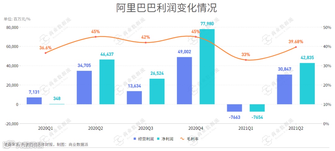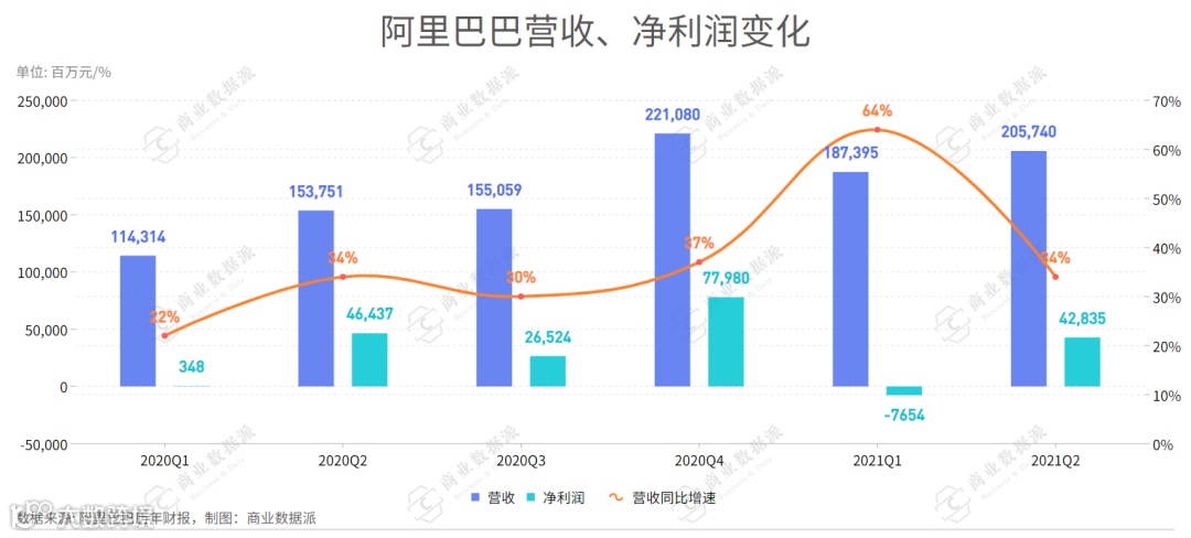 财报显示,截至2021年6月30日季度,阿里巴巴营收2057.4亿元,相较于2020年同期的1537.51亿元,同比增长34%;净利润为428.35亿元,较去年同期的464.37亿元,下降8%;阿里巴巴生态全球年度活跃消费者新增4500万,达11.8亿,其中有9.12亿消费者来自中国市场。