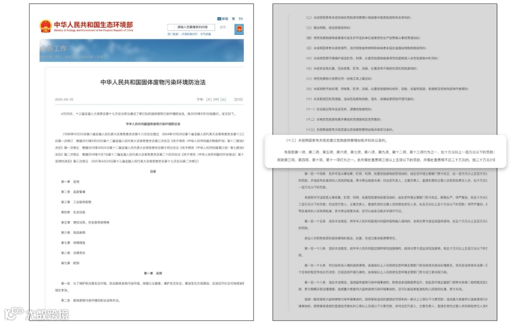 法律责任:若企业未按规定建立或维护危险废物管理台账,将面临法律的制裁和处罚。《固废法》规定:“未按照国家有关规定建立危险废物管理台账并如实记录的,处十万元以上一百万元以下的罚款”,这是一条典型的守法成本低、违法成本高的规定。因未如实记录危险废物台账而受到环保部门的罚款,这不仅影响企业的经济利益,还可能损害企业的环境信用。