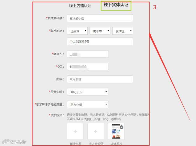 在提交认证页面进行线上或实体店铺认证,根据实际情况提交相关资料。