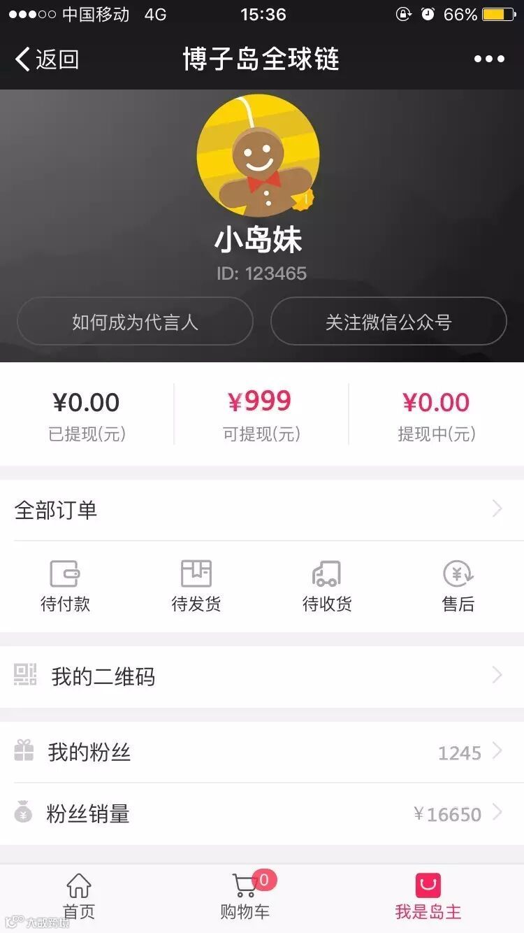 点击商城底部“我是岛主”即可注册成功!系统会自动为每位岛主生成一个专属二维码。岛主通过分享自己的二维码或转发商品链接,收获粉丝!
