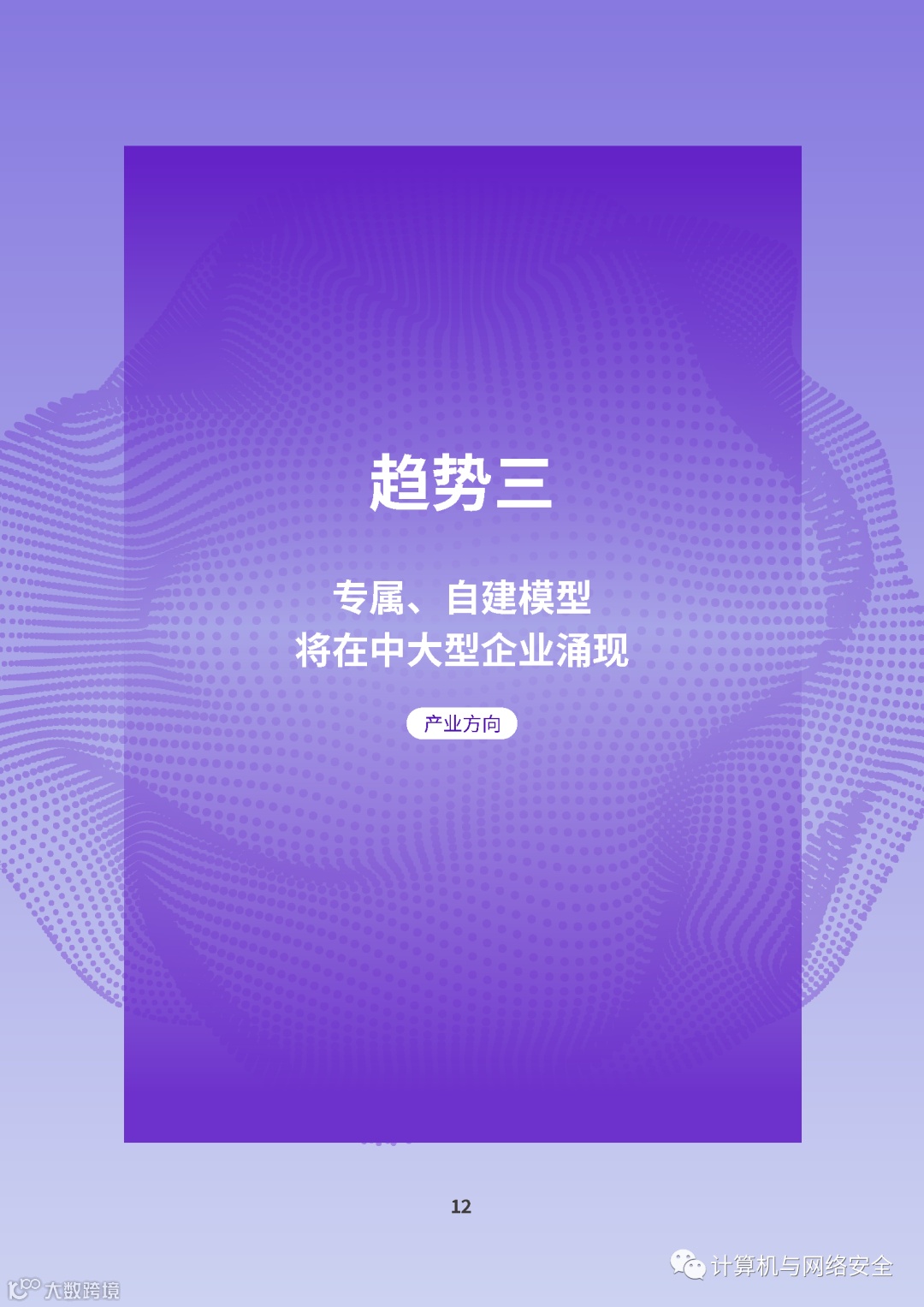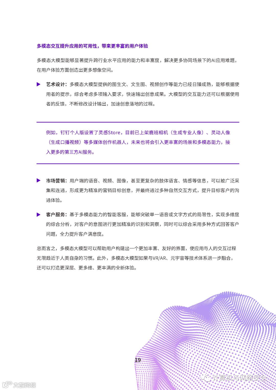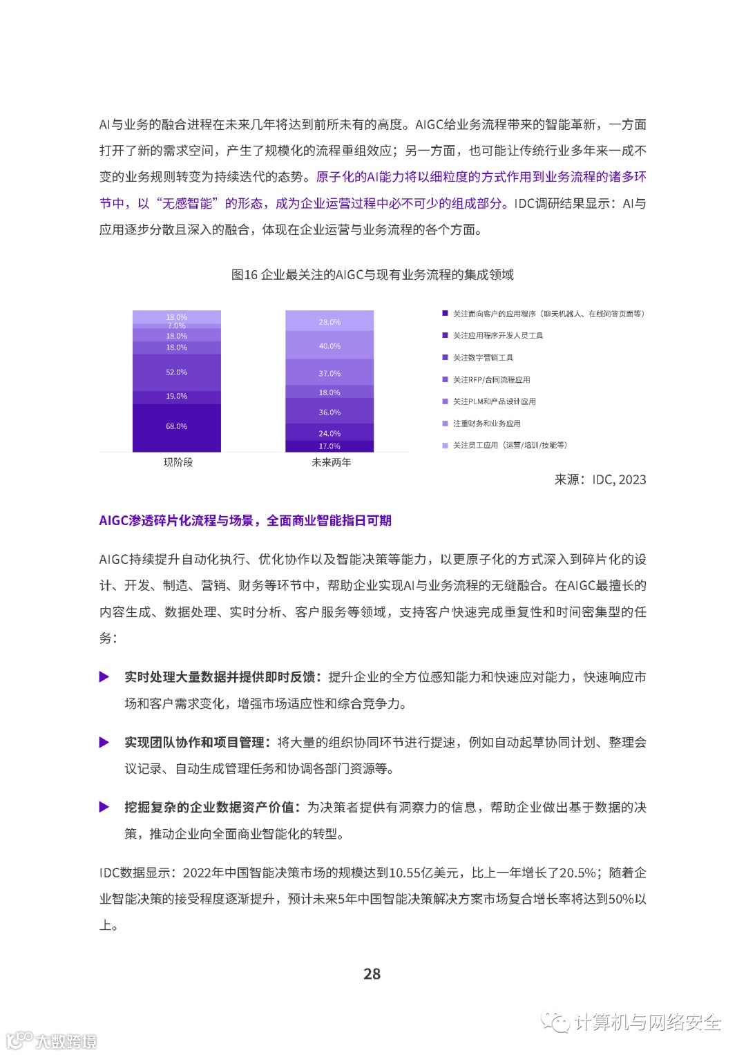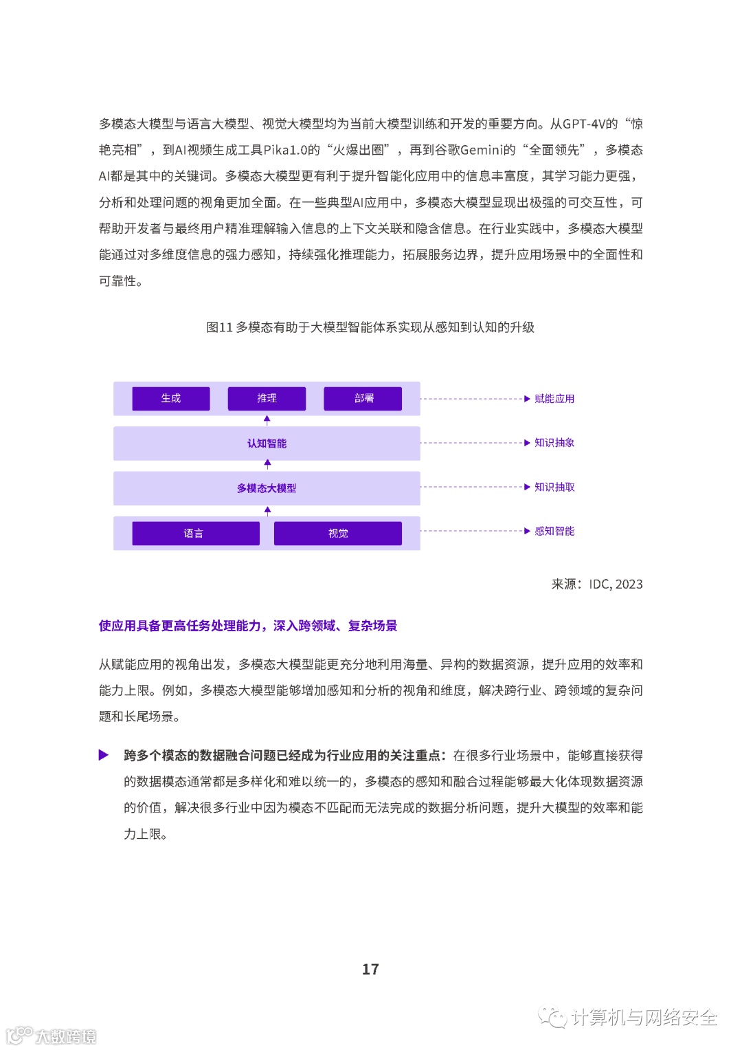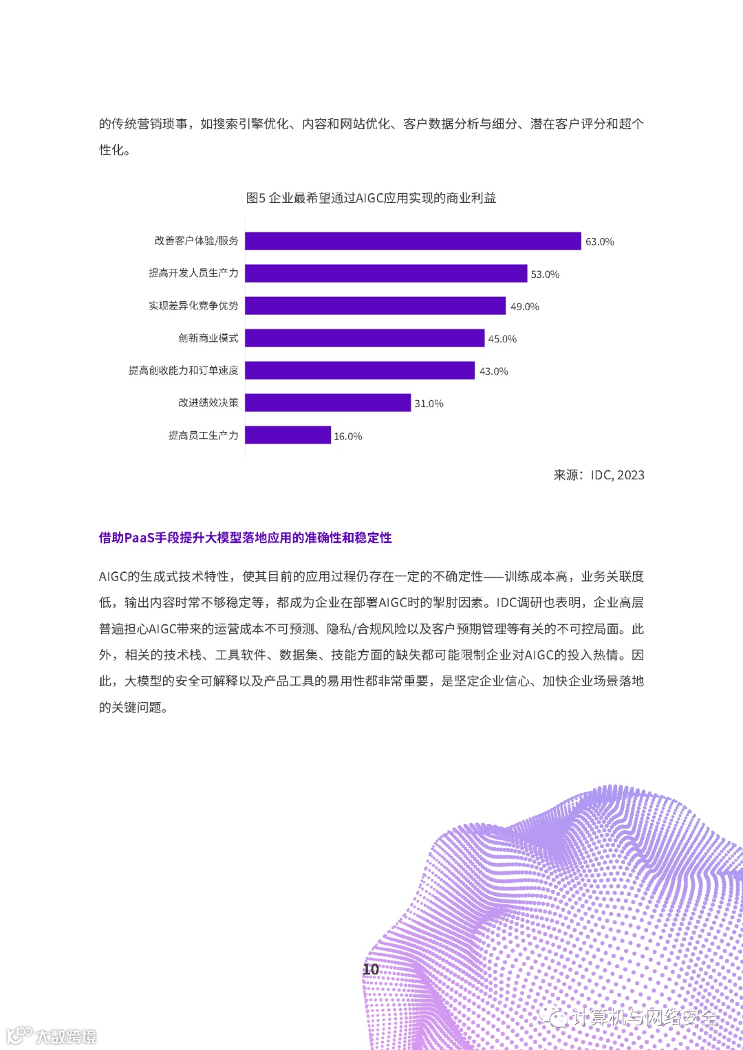 《2024 AIGC应用层十大趋势》从产业方向、应用形态、市场影响的维度给出了生成式AI应用层的十大趋势,让我们认识到2024年是生成式Al的真正落地年,生成式AI正在工具化,大模型也将向多模态、通用化和行业专属化发展。Al Agent作为大模型落地业务场景的主流形式,也将与业务流程无缝融合,有效提升企业生产力。AI原生应用的大幕也已开启,生成式AI将变得更加普惠。此白皮书适合企业业务与技术管理者阅读,对普通业务与数字化技术人员也颇具参考价值。