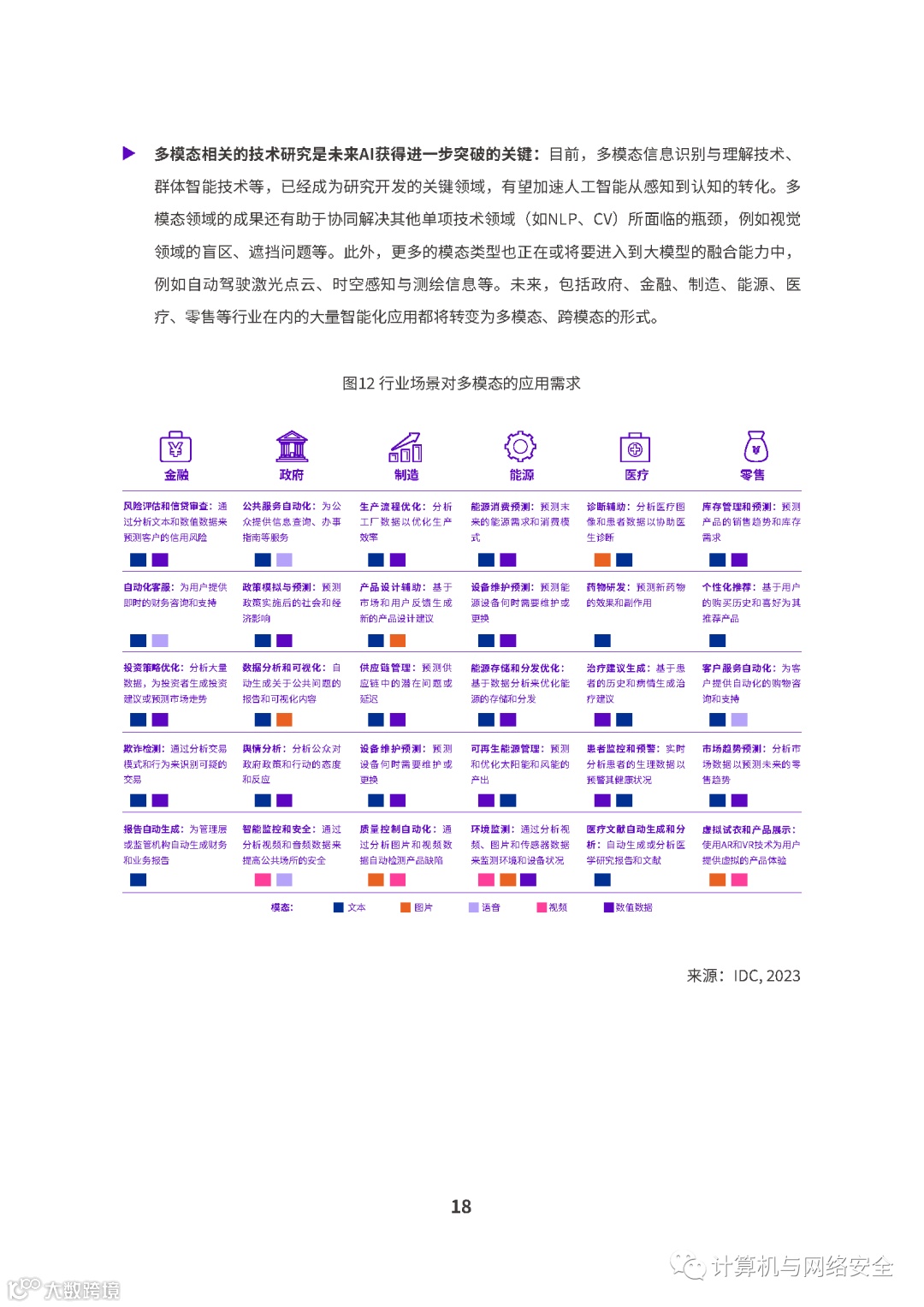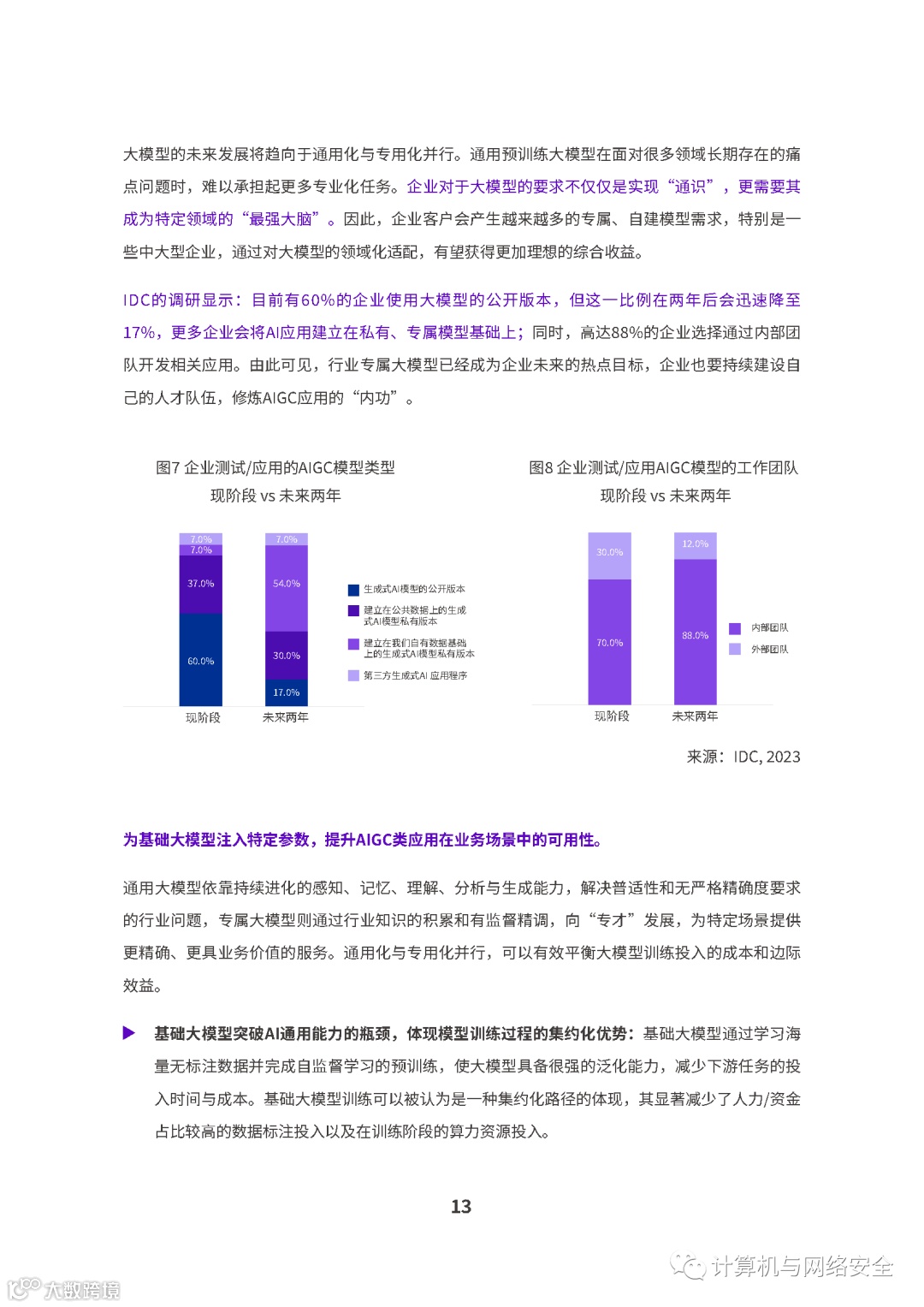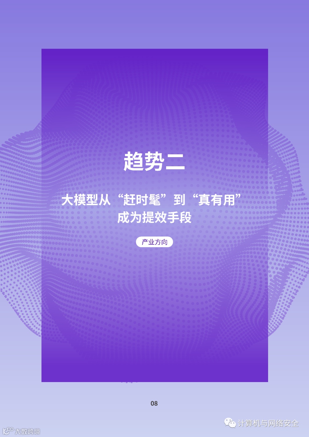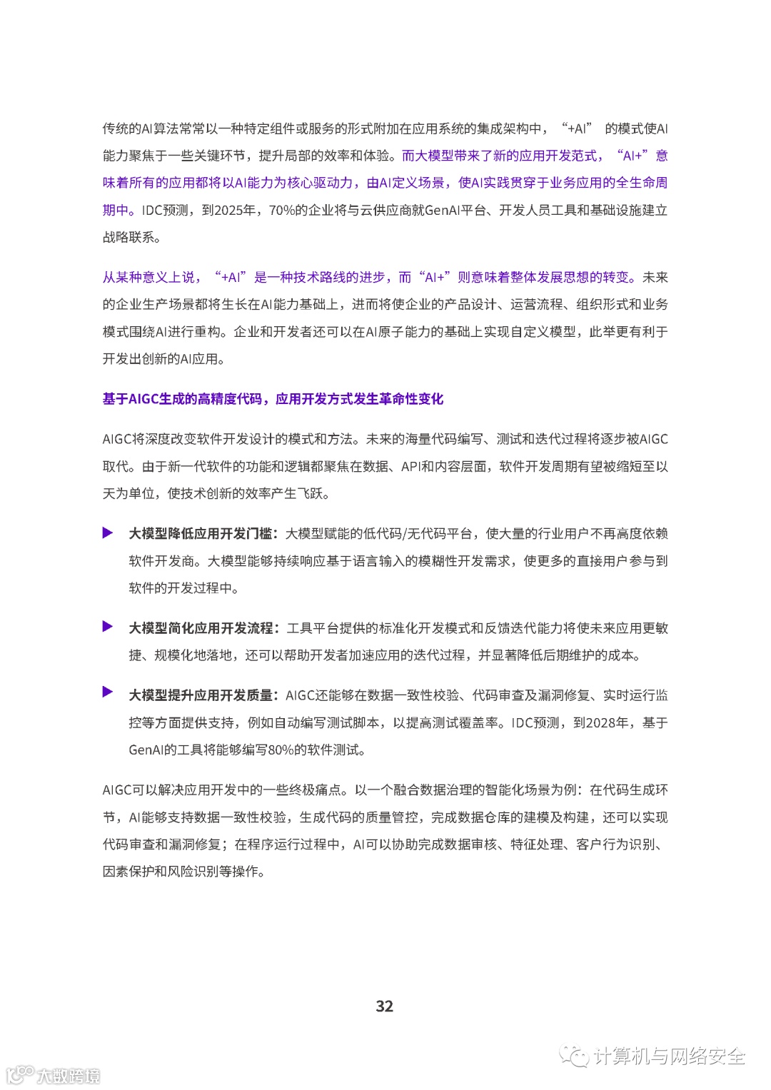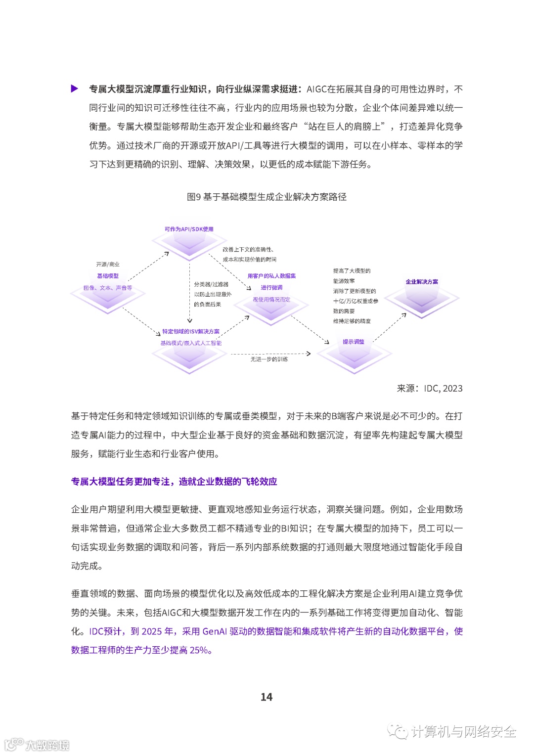 《2024 AIGC应用层十大趋势》从产业方向、应用形态、市场影响的维度给出了生成式AI应用层的十大趋势,让我们认识到2024年是生成式Al的真正落地年,生成式AI正在工具化,大模型也将向多模态、通用化和行业专属化发展。Al Agent作为大模型落地业务场景的主流形式,也将与业务流程无缝融合,有效提升企业生产力。AI原生应用的大幕也已开启,生成式AI将变得更加普惠。此白皮书适合企业业务与技术管理者阅读,对普通业务与数字化技术人员也颇具参考价值。