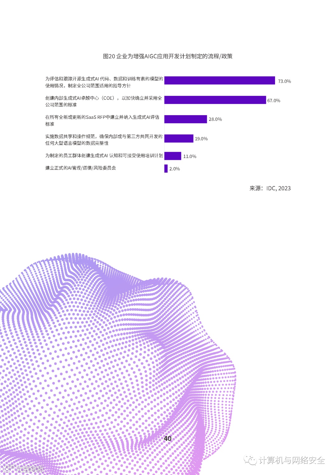 生成式AI正在“听、说、读、写、看、画、思、动”等诸多方面延伸人的能力,行业用户已经开始加速部署。生成式Al正在沿着“智能实习生、个人数字助理、咨询顾问专家、优秀数字员工”方向演进,以钉钉代表的技术厂商推出Al Agent类应用是当前生成式Al落地的一条主流路径,成为多行业用户优先尝试的落地方式。生成式Al正在重塑所有的行业和企业,其应用范围从跨行业应用场景如知识管理、市场营销、客户服务、代码生成、艺术设计等逐渐向行业专属的应用场景过渡,如金融行业的投资策略优化、政府行业的政策模拟与预测、制造行业的产品研发与设计、零售行业的虚拟试衣与产品展示、医疗行业的诊断辅助与医疗建议生成等。IDC调研显示,35%的中国企业正在做大模型的初步测试和概念验证,24%的中国企业已经在生成式AI方面投入了大量资金。