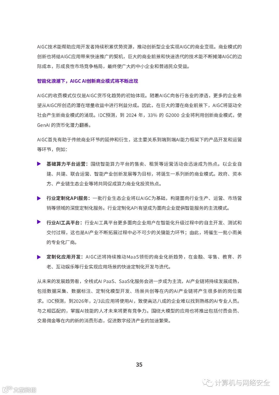 大模型、AIGC的应用落地也将创新产业生态模式,MaaS、PaaS将成为智能经济时代的重要业态。目前已有的基础大模型很难直接应用于各行业领域,企业需要结合自身的行业特点和专业知识,研发出可嵌入MaaS和PaaS的适合企业自身的行业大模型、专属大模型或场景大模型。既能避免开发大模型所需要的大量投入和人才,又能充分利用大模型的通用能力,以实现自己个性化的需求。